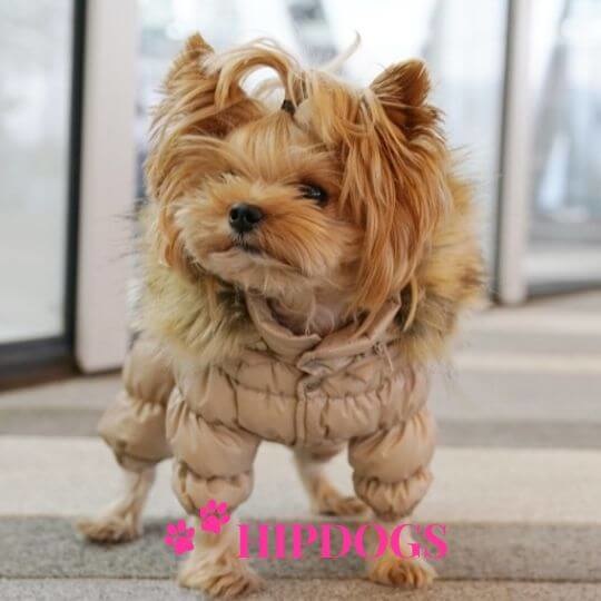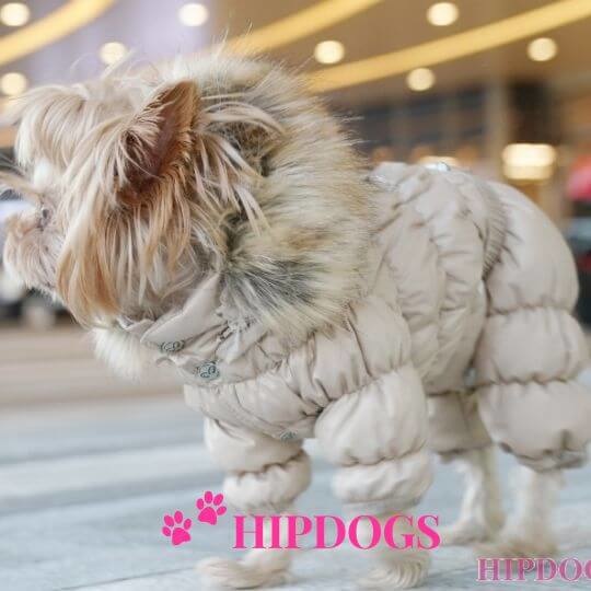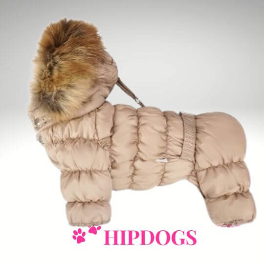 Mooi Puppy Angel skipak beige met imitatie bont capuchon. De gehele buik is bedekt waardoor dit skipak alleen geschikt is voor teefjes.