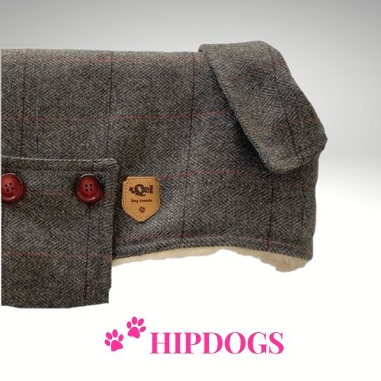 Mooie Engelse tweed Teckel jas. Met je teckel in deze mooie donker grijze tweed jas wanen jullie je meteen in Engeland