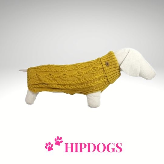 Deze Teckel trui van Merino wol is perfect voor herfst- en winterdagen, wandelingen, of als extra laag onder een hondenjas. Geef je Teckel warmte, comfort en stijl met deze stijlvolle oker gele honden trui, ontworpen voor langgerugde honden zoals Teckels en Dachshunds.